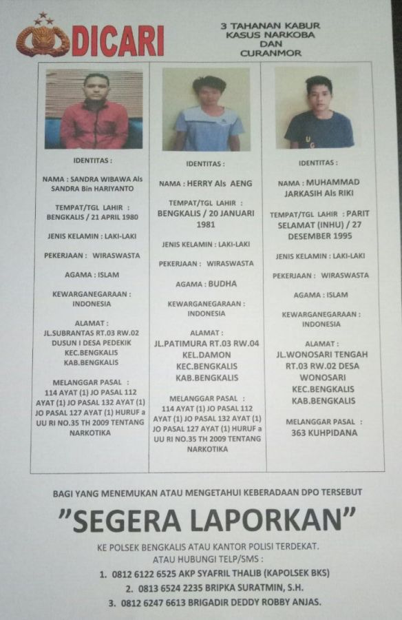 Ketiga orang yang kabur dari tahanan Polsek Bengkalis ini, merupakan 2 orang tahanan terkait kasus narkoba dan satu orang lagi merupakan kasus Pencurian Sepeda Motor (Curanmor).