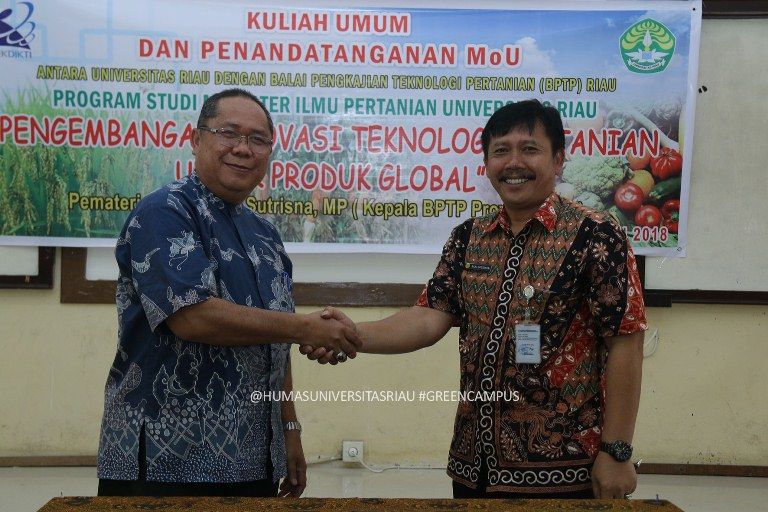 Hal ini disampaikan Dekan Fakultas Pertanian Unri Dr Ir Syafrinal MS, pada acara Kuliah Umum dan Penandatanganan Nota kesepahaman bersama MoU dan MoA antara Unri dengan Balai Pengkajian Teknologi Pertanian (BPTP) diruang pertemuan Fakultas Pertanian, Rabu 25 April 2018.