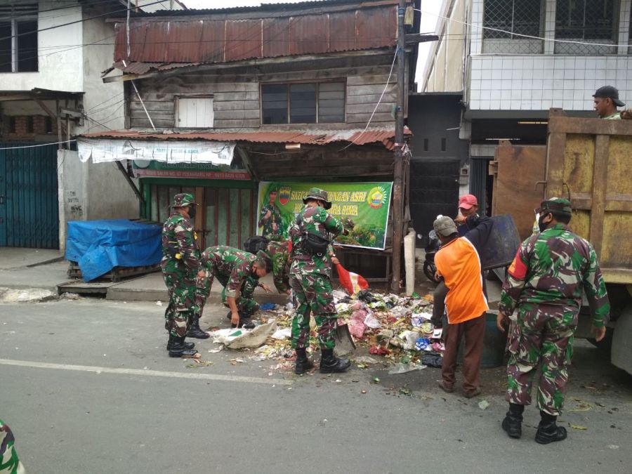 Gotong royong ini kata Serda Robert Sitorus sebagai bentuk kepedulian TNI terhadap kebersihan lingkungan dari sampah.