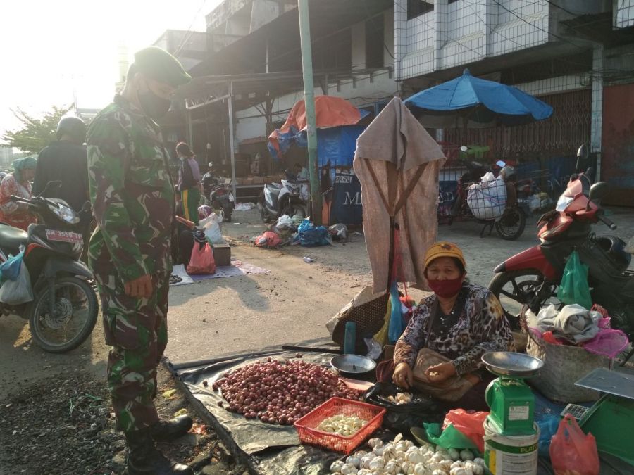RIAUPUNYA---Babinsa Koramil 02 Kota Kodim 0301 Pekanbaru Pelda Adi Yusuf dan Serda Robert Sitorus mengimbau masyarakat di Pasar Agussalim untuk tidak mengabaikan disiplin protokol kesehatan.