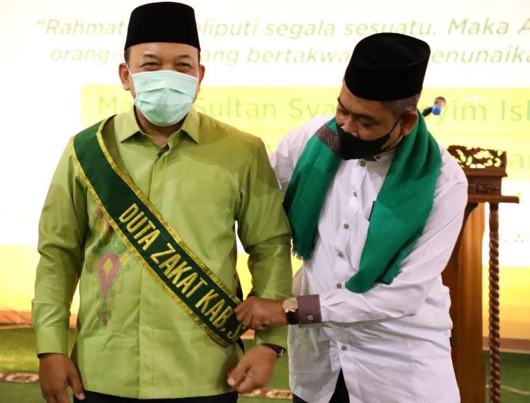 Penganugerahan Wakil Bupati Siak Husni Merza Sebagai Duta Zakat Kabupaten Siak, dilakukan secara seremonial dengan memasangkan selempang tanda kehormatan sebagai Duta Zakat Baznas Kabupaten Siak oleh Komisioner Baznas Provinsi Riau, Yahanan.