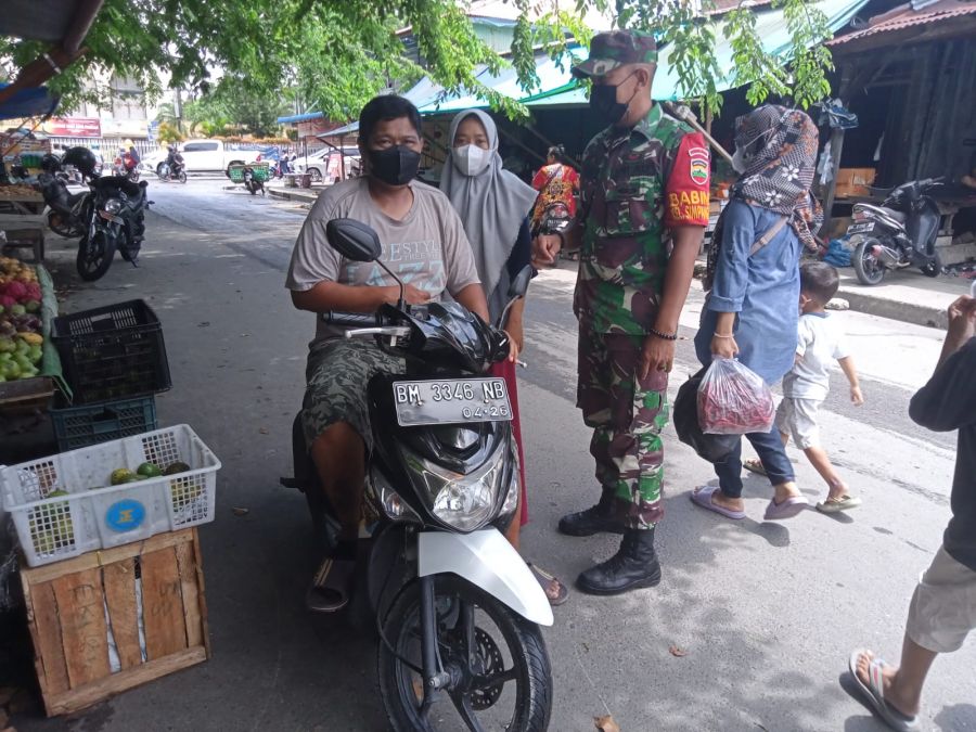 Rabu (27/7/2022) Kopda Ario Diansah melaksanakan komunikasi sosial dan imbauan protokol kesehatan di Pasar Agussalim, Kecamatan Pekanbaru Kota.