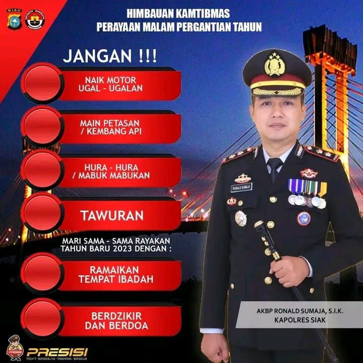 Ajakan tersebut tersebut disampaikan oleh Kapolres Siak Ronald Sumaja SIK, Kamis 29 Desember 2022 kemarin. "Mari kita sambut tahun 2023 dengan hal-hal yang positif, terutama bagi anak remaja yang ada di wilayah hukum Polres Siak untuk tidak berkendaraan secara ugal-ugalan, dan juga tidak bermain mercun," tegas Kapolres Ronald.