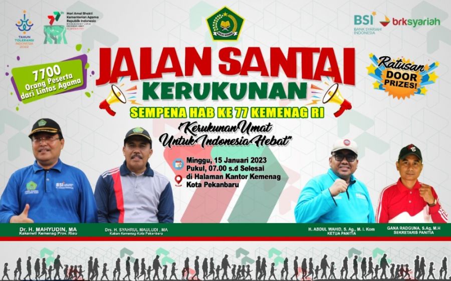 RiauPunya.com -- Bekerjasama dengan Kantor Wilayah Kementerian Agama (Kanwil Kemenag) Provinsi Riau, Kamenag Kota Pekanbaru, Ahad 15 Januari 2023 besok, akan melaksanakan kegiatan Jalan Santai kerukunan, kegiatan ini puncak dari peringatan Hari Amal Bakti ke-77 Kemenag tahun 2023.