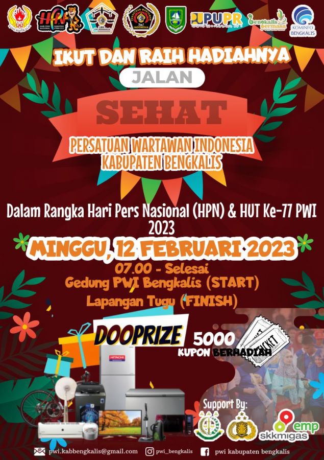 Ketua Persatuan Wartawan Indonesia (PWI) Kabupaten Bengkalis Adi Putra mengatakan jalan sehat yang akan dilaksanakan nantinya pihak panitia jalan sehat telah mempersiapkan 5.000 kupon dan puluhan hadiah termasuk hadiah utama.