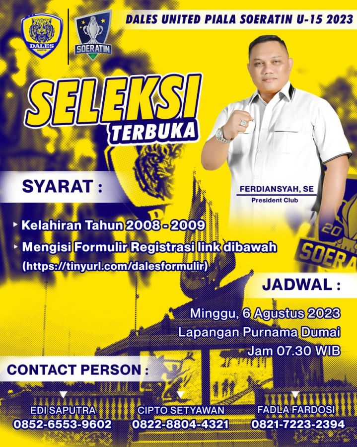 Presiden Dales United Ferdiansyah SE, melalui Manager Tim, Fadla Fardosi S.Pd menyampaikan seleksi terbuka ini dilaksanakan Minggu 6 Agustus 2023 mendatang di lapangan Purnama Dumai pukul 07.30 WIB.