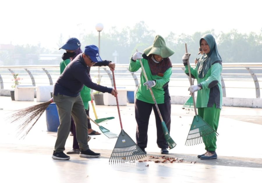 "Alhamdulillah hari ini saya bersama seluruh kepala OPD beserta Staff, melaksanakan gotong royong di Taman Siak Bermadah dan dilanjutkan di Tepian Bandar Sungai Jantan", kata Arfan.