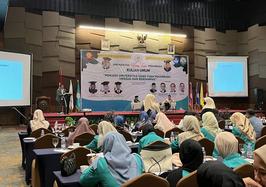 PEKANBARU (Riaupunya.com) - Ketua Persatuan Wartawan Indonesia (PWI) Provinsi Riau Raja Isyam Azwar hadir sebagai pemateri pada Kuliah Umum Universitas Hang Tuah Pekanbaru, Senin 8 September 2025.