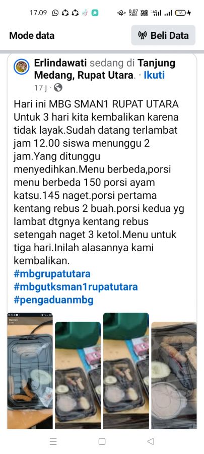 Keluhan tersebut viral di media sosial setelah seorang guru SMAN 1 Rupat Utara, Erlindawati, mengunggah kondisi makanan yang diterima sekolah melalui akun Facebook miliknya. Dalam unggahan tersebut, ia menjelaskan alasan pihak sekolah mengembalikan makanan MBG yang dikirim.